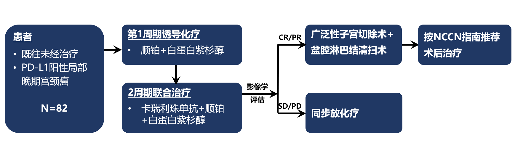 这是一项多中心、单臂II期临床研究,纳入既往未经治疗、PD-L1表达阳性(CPS≥1)、局部晚期(FIGO IB3、IIA2和≥4cm IIB/IIIC1r 期)宫颈癌患者。患者先接受1个周期诱导化疗,再接受2个周期化疗联合卡瑞利珠单抗治疗,疗效评估为CR/PR的患者接受手术(根据NCCN指南推荐术后辅助治疗),SD/PD患者则接受同步放化疗。