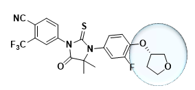 接下来进入第二轮优化。在第1个候选化合物的杂环氧基上引入羟基取代基,得到了第2个候选化合物(图3)。这款化合物体外活性略优于全球首个二代AR拮抗剂。与候选化合物1相比,分子极性增加,clogP降低,hERG钾通道抑制作用也大大降低,同时大鼠口服吸收利用度也有了大幅提升。然而美中不足的是,这款化合物结构较为复杂,分子中含有两个手性中心,合成难度高,在药物的可开发性上不是很优异。