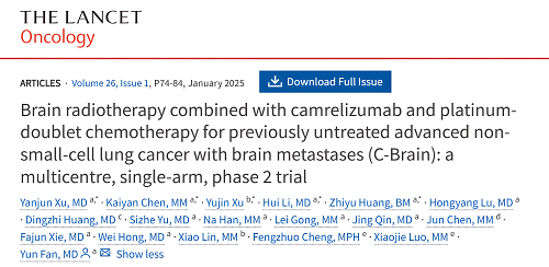 2025年1月3日,由浙江省肿瘤医院范云教授团队牵头开展的一项卡瑞利珠单抗联合脑部放疗及含铂双药化疗治疗初治晚期非小细胞肺癌合并脑转移患者的多中心、单臂的Ⅱ期临床研究(C-Brain)于国际肿瘤学领域顶级期刊《柳叶刀·肿瘤学》《The Lancet Oncology》(IF:41.6)1在线发表。