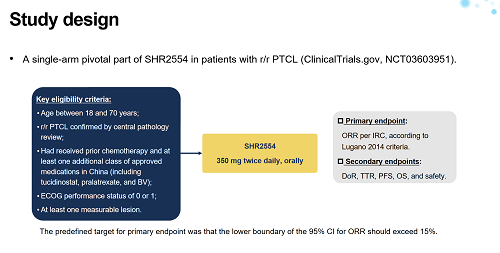 SHR2554是一种口服、选择性小分子EZH2抑制剂,对野生型和突变型EZH2均表现出强抑制性。为评估 SHR2554 在复发/难治性成熟淋巴肿瘤(包括B细胞淋巴瘤、T细胞淋巴瘤和经典型霍奇金淋巴瘤)患者中的安全性、药代动力学、药效学和初步临床活性,开展了一项SHR2554首次人体、剂量递增、剂量扩展和临床扩展的多中心、2-PART临床研究(NCT03603951)。PART 1研究中,确定了 SHR2554的推荐剂量为 350 mg每日两次口服,并且研究结果初步显示出了 SHR2554对包括PTCL在内的多种淋巴瘤类型均表现出较强的抗肿瘤活性[8,9]。因此继续开展PART 2作为SHR2554在R/R PTCL的单臂关键性研究,来进一步评估SHR2554在R/R PTCL患者中的疗效和安全性,本次EHA口头报告了此项研究的结果。